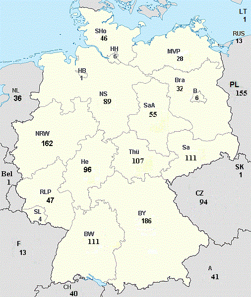Bra BW BY CH CZ F HB He HH LT MVP NL NRW NS PL RLP RUS Sa SaA SHo SK SL Thü / Anzahl PM | ||